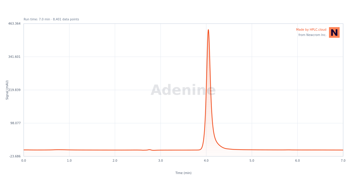 The HPLC Method for Analysis of Adenine on Alltesta™ Gradient is designed for Adenine, a nucleotide base compound. Adenine is a chemical compound with the molecular formula C5H5N5.