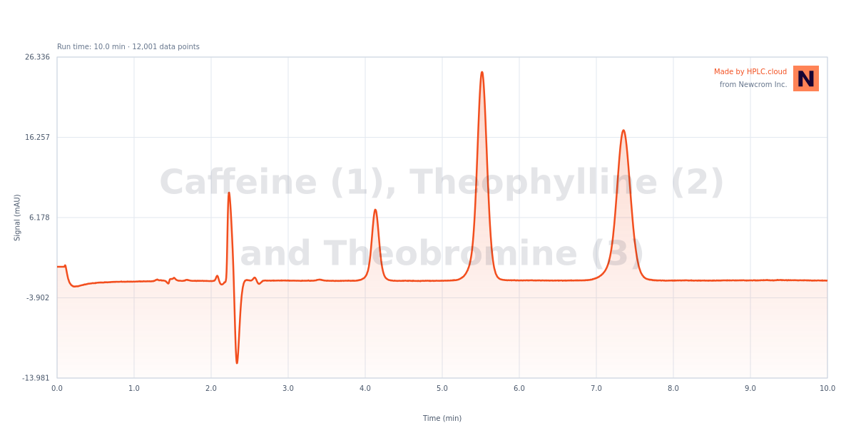 Caffeine is a natural stimulant and methylxanthine alkaloid. with the molecular formula C6H10N4O2. Caffeine can be found in a variety of plants, including tea, coffea, cocoa, kola nuts, and guarana. Ingestion of it can increase alertness and cognitive function. It can also cause worsening anxiety, heart palpitations, and headaches. Theophylline is a methylxanthine compound with the molecular formula C7H8N4O2. It is a caffeine metabolite and is often used in forensic analyses. Besides analytical use, it is often used in treating respiratory conditions. Theobromine is a methylxanthine alkaloid with the molecular formula C7H8N4O2. It is a derivative of caffeine. It can be found in many foods, including chocolate and tea. Despite that, it is toxic to dogs. Caffeine, Theobromine, Theophylline can be retained and analyzed using the Primesep SB stationary phase column. The analysis utilizes an isocratic method with a simple mobile phase consisting of water and ethanol (EtOH) with a phosphoric acid buffer. Detection is performed using UV.