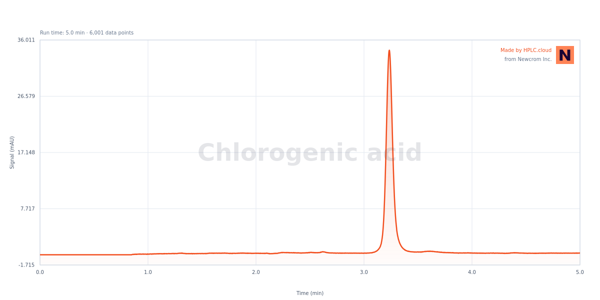 Chlorogenic acid is a natural compound that belongs to the polyphenol family, which is abundant in various plants. It is particularly prevalent in coffee beans, fruits, vegetables, and whole grains. One of its primary dietary sources is coffee, where it is found in significant amounts. It is well known for it’s antioxidant properties, which means it can help neutralize free radicals in the body. Free radicals are molecules that can damage cells and contribute to aging and various diseases. Evidence suggests that chlorogenic acid may have a positive impact on blood sugar levels. It may help regulate glucose metabolism, making it of interest in managing diabetes and insulin resistance. You can find detailed UV spectra of Chlorogenic acid and information about its various lambda maxima by visiting the following link. Chlorogenic acid can be retained and analyzed using the Chromni™ stationary phase column. The analysis utilizes an isocratic method with a simple mobile phase consisting of water and acetonitrile (MeCN) with phosphoric acid as a buffer. Detection is performed using UV.
