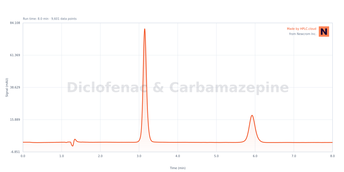 Diclofenac is a nonsteroidal anti-inflammatory drug (NSAID) with the molecular formula C14H11Cl2NO2. It is a pain killer that also relieves symptoms of arthritis. It is only accessible through a prescription from a medical professional. Carbamazepine is a anticonvulsant medication with the molecular formula C15H12N2O. It is typically used to treat epilepsy, bipolar disorder, and nerve pain. It works through calming overactive nerves through binding voltage-dependent sodium channels. Diclofenac, Carbamazepine can be retained and analyzed using the Primesep 100 stationary phase column. The analysis utilizes an isocratic method with a simple mobile phase consisting of water and acetonitrile (MeCN) with a sulfuric acid buffer. Detection is performed using UV.
