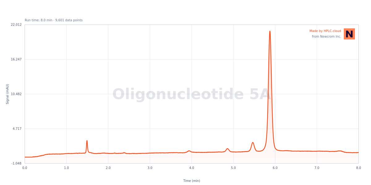 Oligonucleotide 5A is a small RNA molecule with a specific adenine sequence. They are primarily used to inhibit viral and cancer cell growth. In RNA synthesis, they are intermediates in enzymatic synthesis of capped RNAs. Oligonucleotide 5A can be retained and analyzed using the Chromni™ stationary phase column. The analysis utilizes a gradient method with a simple mobile phase consisting of water and acetonitrile (MeCN) with an ammonium formate as a buffer. Detection is performed using UV.