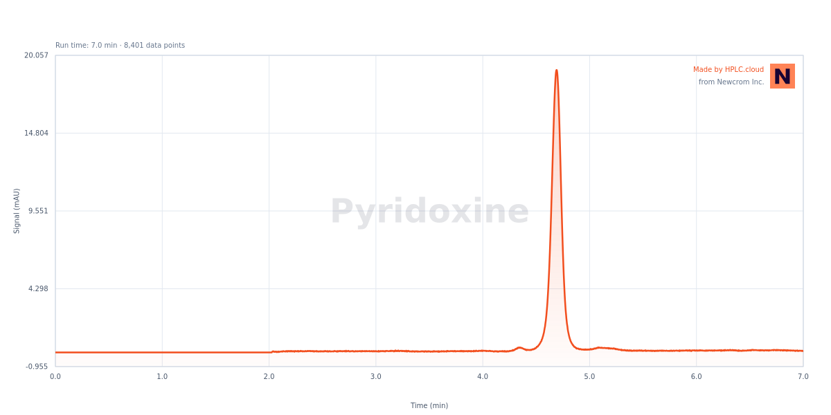 Pyridoxine, also known as Vitamin B6, with the chemical formula C8H11NO3. It is an essential nutrient required by the body to produce red blood cells and for proper nerve functioning. Sources of it include fish, beef liver, chicken, eggs, dark leafy greens, potatoes, chickpeas, cereals, and more. Deficiency of Vitamin B6 can case dermatitis, sores in the mouth, depression, anemia, and seizures. You can find detailed UV spectra of Vitamin B6 (Pyridoxine) and information about its various lambda maxima by visiting the following link. Vitamin B6 (Pyridoxine) can be retained and analyzed using the Primesep 100 stationary phase column. The analysis utilizes an isocratic method with a simple mobile phase consisting of water and acetonitrile (MeCN) with phosphoric acid as a buffer. Detection is performed using UV.