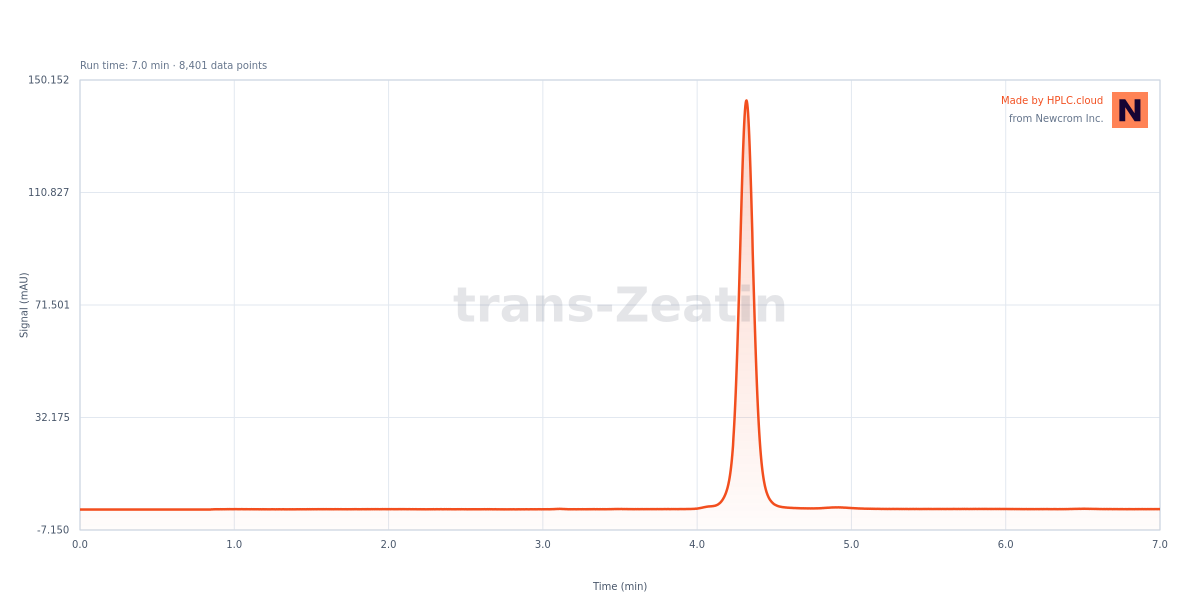 The HPLC Method for Analysis of trans-Zeatin on Alltesta™ Gradient is designed for trans-Zeatin, a cytokinin compound. trans-Zeatin is a cytokinin derived from adenine with two forms, cis- and trans-isomer.
