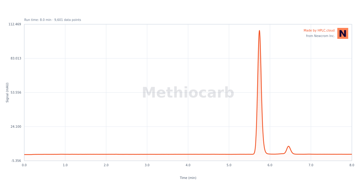 Methiocarb is a carbamate pesticide with the chemical formula C11H15NO2S. It works as a acetylcholinesterase inhibitor. It has been in use as an insecticide, bird repellent, acaricide, and molluscicide since 1960s. Methiocarb can be retained and analyzed using the Newcrom B stationary phase column. The analysis utilizes an isocratic method with a simple mobile phase consisting of water and acetonitrile (MeCN) with ammonium formate as a buffer. Detection is performed using UV.