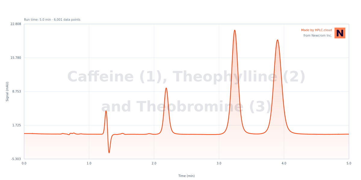 The HPLC Method for Analysis of Caffeine (1), Theophylline (2) and Theobromine (3) on Cromite™ is designed for Caffeine (1), Theophylline (2) and Theobromine (3), a alkaloid compound. Caffeine is a natural stimulant and methylxanthine alkaloid.